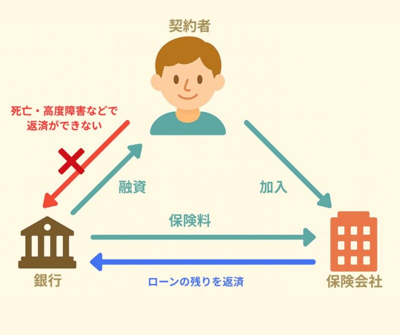 住宅ローンの返済中に契約者が死亡、または高度障害状態になった場合、ローン残高を肩代わりして完済する生命保険です。民間金融機関の住宅ローンではほとんどの場合、加入が義務付けられています。
