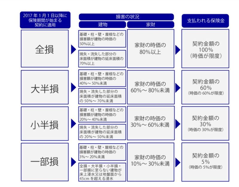 損害の程度により「全損」「大半損」「小半損」「一部損」の4段階で区分され、それぞれに定められた保険金が支払われます。